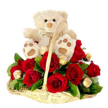 Take your relation beyond the boundaries of time and age. Anniversary is a celebration of years that are spent together. Let this special occasions be cherished with a lovely collection of a cute 6" inch teddy with 16 pcs ferrerorocher chocolates & 20 red roses in a cane handle basket.