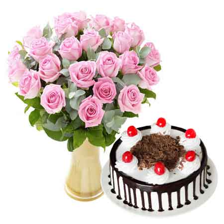 Send this very gorgeous collection of 20 pink roses arranged together in a pretty looking vase along with a refreshing half kg black forest cake prepared with fluffy sponge, crunchy chocolate chips and fresh cherries. This is going to be a decent gift set for any occasions or festival.