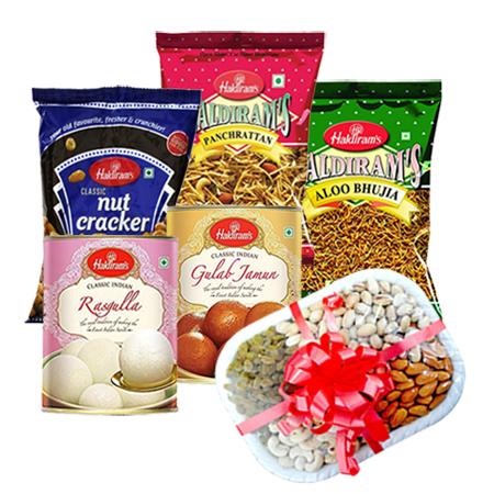 400gms HALDIRAM PANCHRATAN NAMKIN, 400 gms HALDIRAM ALOO BHUJIA, 400gms HALDIRAM NUT CRACKER, 1KG HALDIRAM RASGULLA, 1KG HALDIRAM GULAB JAMUN, HALF KG ASSORTED DRY FRUITS.