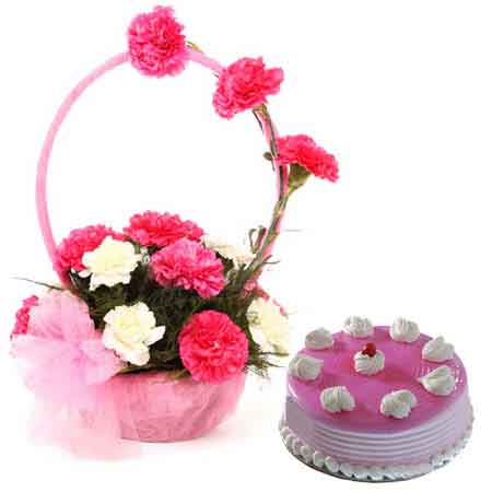 It is said behind success of every man there is a woman. Sowhether it is your mother, wife or sister let the special woman in your life realize that they are very special to you. Gift them this marvelous gift that comprises of 12 pink & 3 white beautiful carnations in a pretty handle basket arrangement decorated with pink net and a pink colored Half kg strawberry cake.